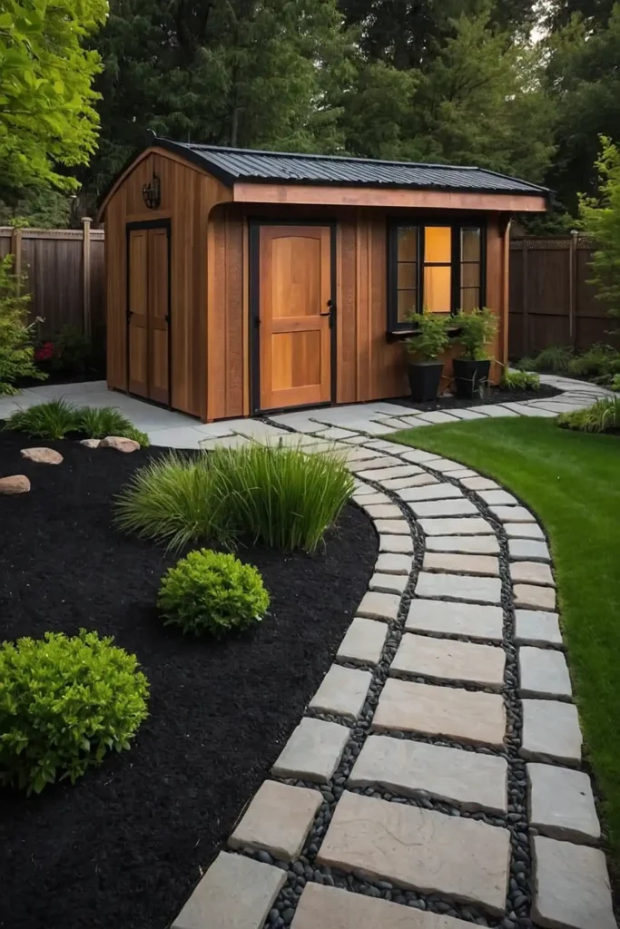 Create a gently winding pathway leading to your shed using materials that complement your home’s exterior.