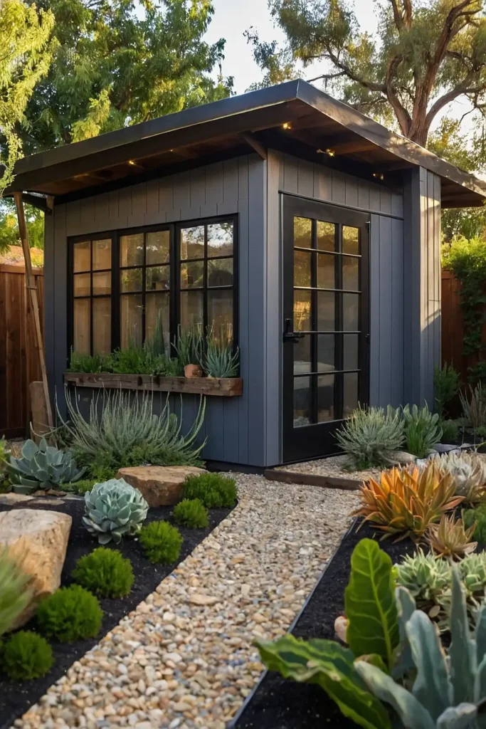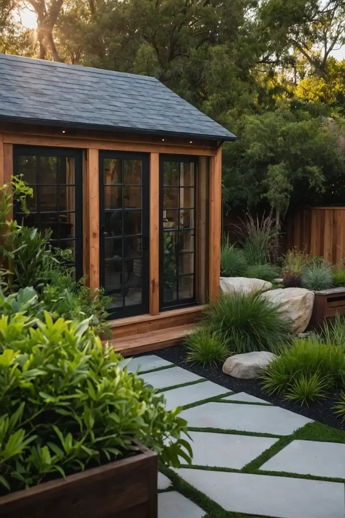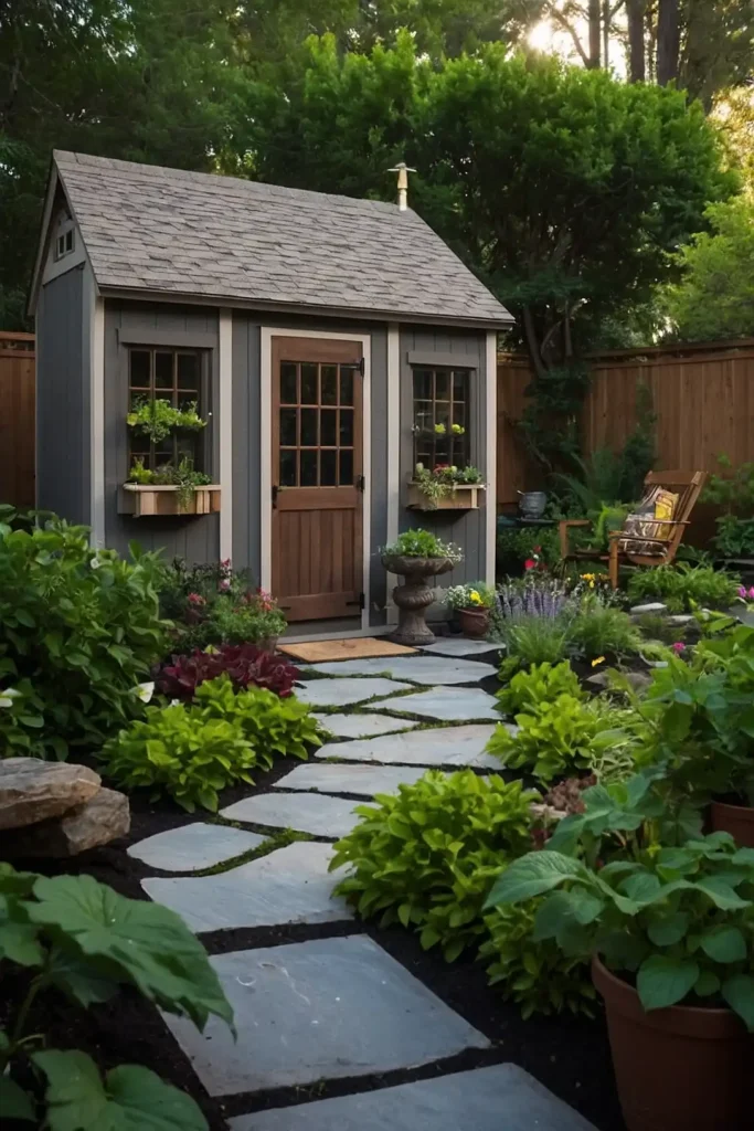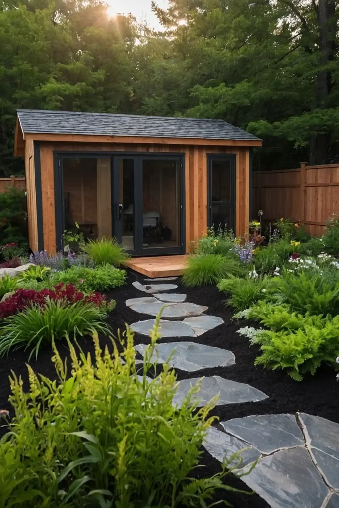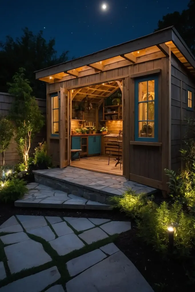 Add low-voltage landscape lighting that gently illuminates the pathways and highlights architectural features of your shed after dark.