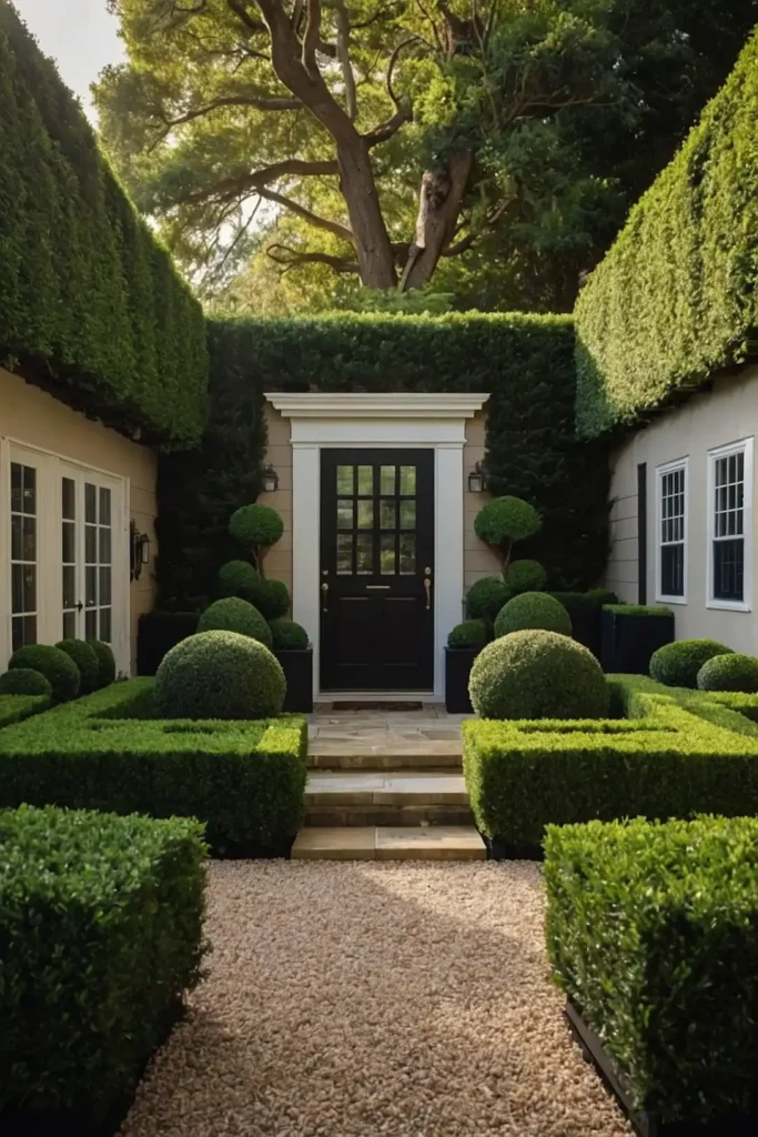 Fill the spaces between hedges with gravel, seasonal flowers, or herbs depending on your preferred maintenance level and aesthetic.