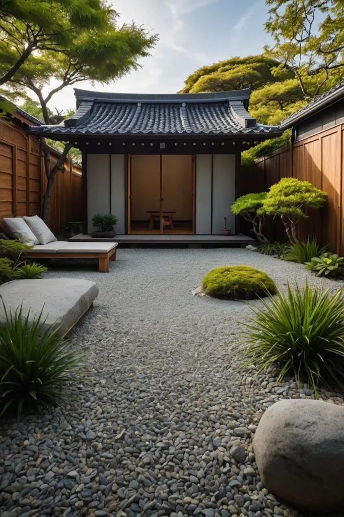 Create a low-maintenance zen-like setting using carefully placed rocks within a sea of raked gravel surrounding your shed.