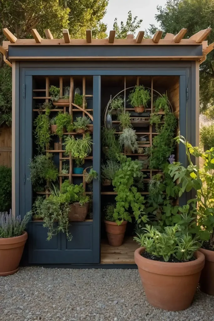 Construct a spiral-shaped raised bed near your shed entrance filled with sun-loving Mediterranean herbs like rosemary, thyme, and sage.