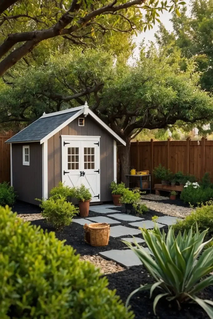 Choose materials like cedar chips, cocoa hulls, or river rock that complement your shed’s color while suppressing weeds.