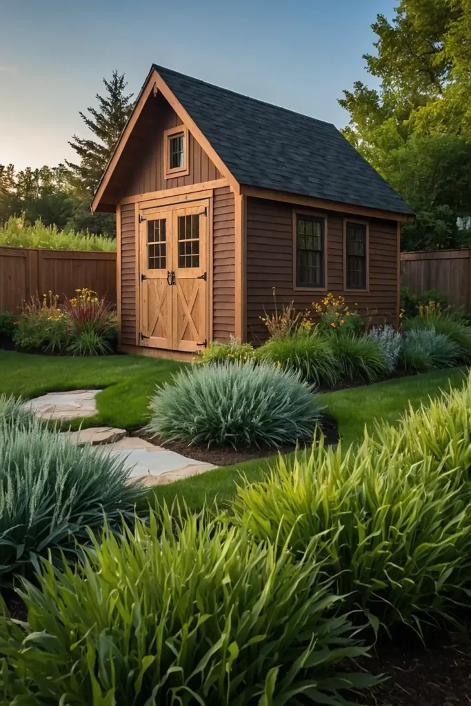 Landscape around your shed with indigenous plants that thrive naturally in your local climate without requiring extensive maintenance.