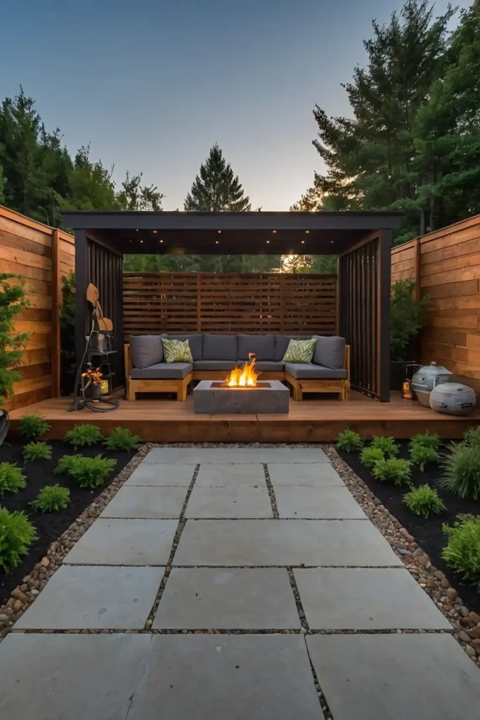 Design a small gathering space with a fire pit near your shed, using the structure as a windbreak and backdrop for evening enjoyment.