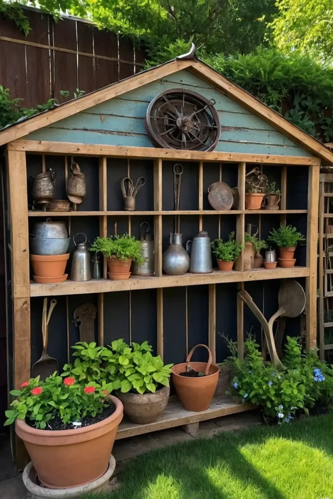 Arrange a thoughtful collection of antique garden tools, weathered containers, or architectural salvage pieces around your shed’s exterior.
