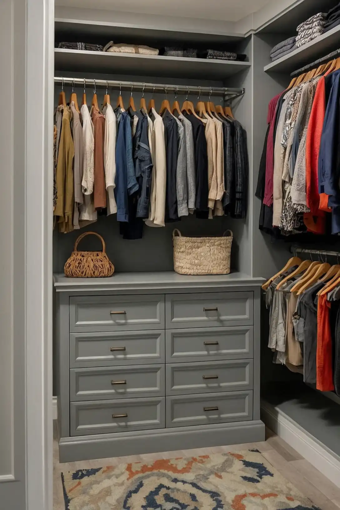 Pair with white shelving for a clean, organized look that helps define closet zones visually.