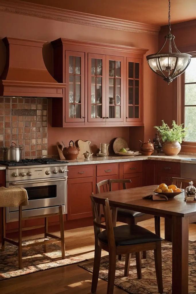 Soft terracotta creates a Mediterranean-inspired kitchen when paired with cherry cabinets.