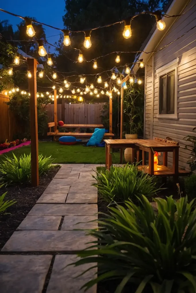 Create an enchanted play space by incorporating string lights into tree houses, play structures, or dedicated kid zones.