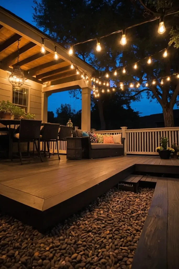 Install string lights beneath your elevated deck to illuminate the underside, creating useful light for storage areas or lower patios while adding unexpected visual interest to your landscape.