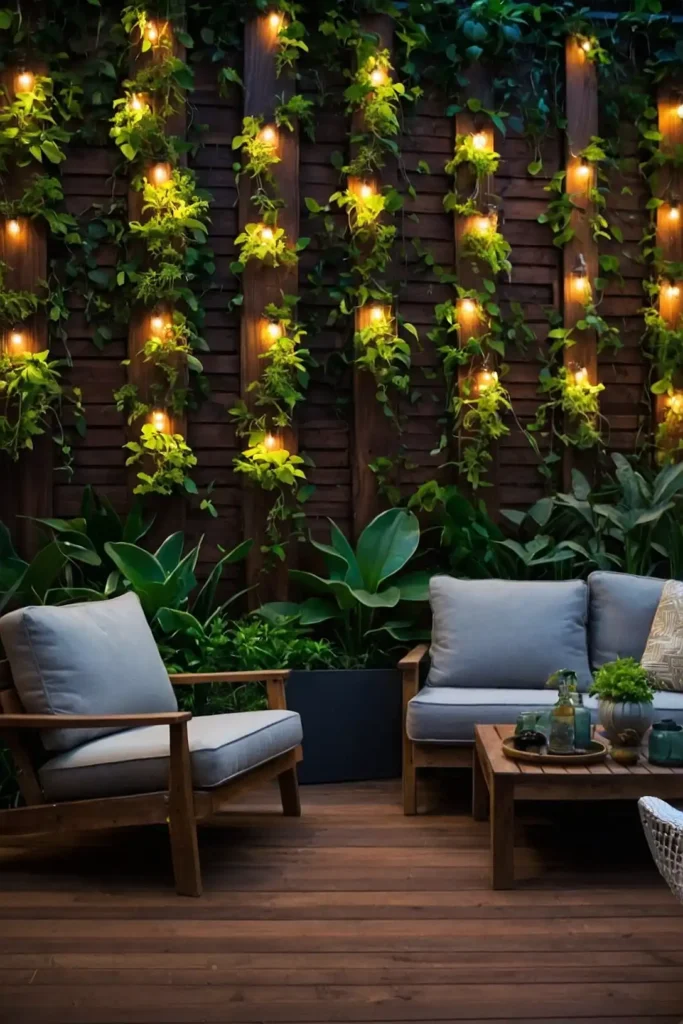 Integrate string lights into your vertical garden or living wall to highlight greenery after dark.