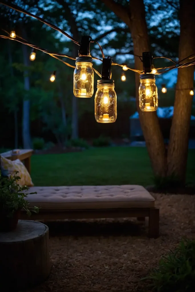 Combine string lights with mason jars to create charming luminaries that can hang from trees, fences, or shepherd’s hooks.