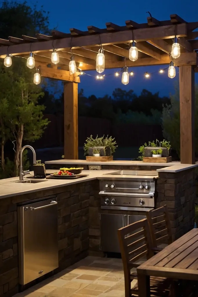 Integrate string lights into your outdoor kitchen structure to combine task lighting with ambiance.
