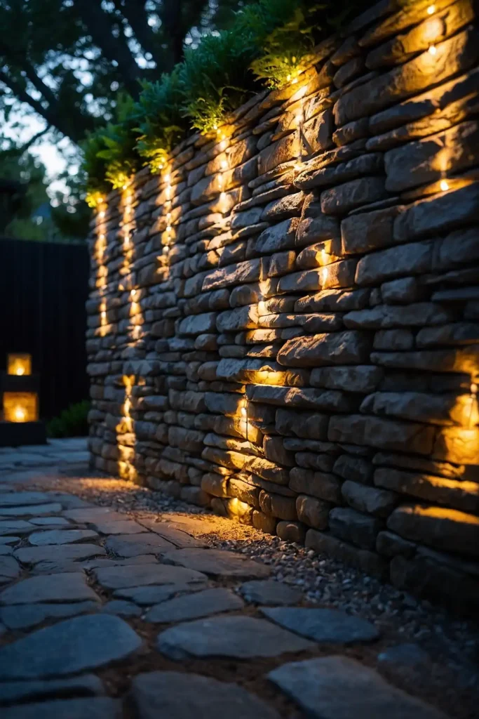 Accentuate the texture of stone walls, rock gardens, or masonry features by installing string lights along their top edge or within crevices.