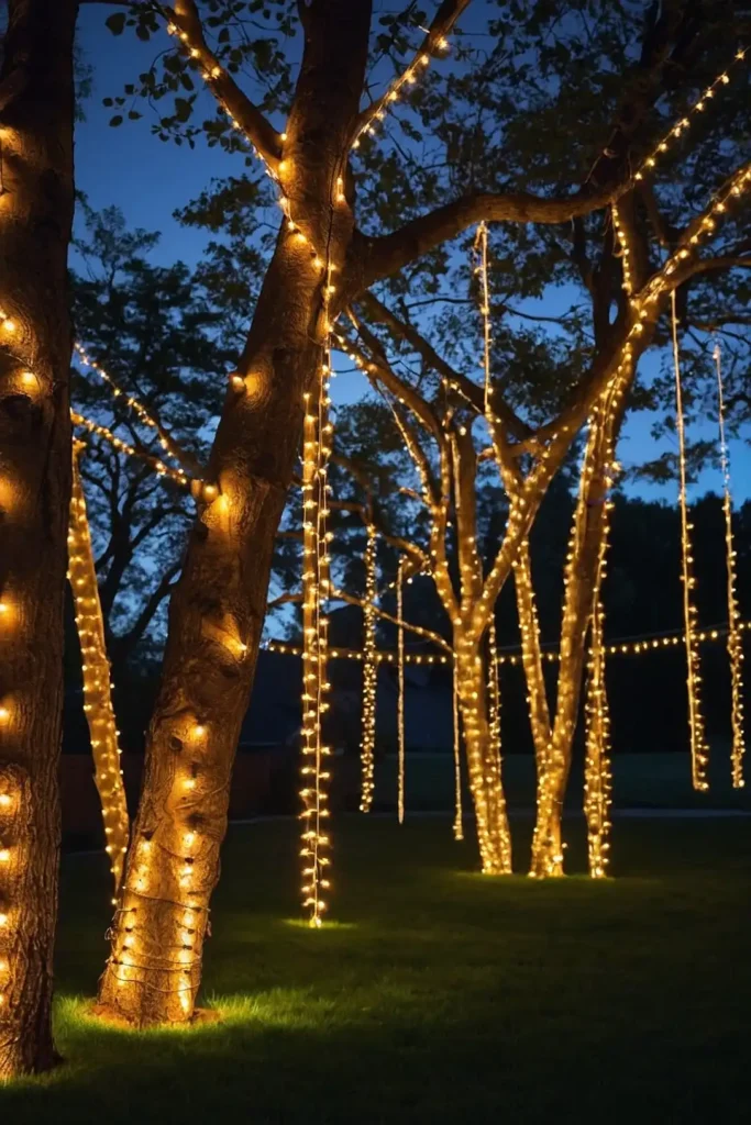 Transform trees into enchanted forest features by wrapping their trunks with string lights in a vertical, vine-like pattern.