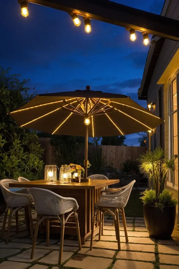 Thread string lights along the ribs of your patio umbrella to create a magical overhead glow during evening gatherings.