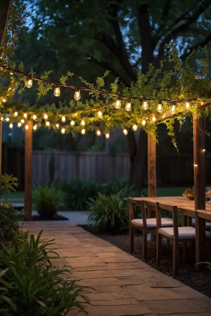 Incorporate string lights into garden trellises to highlight climbing plants and architectural garden elements.
