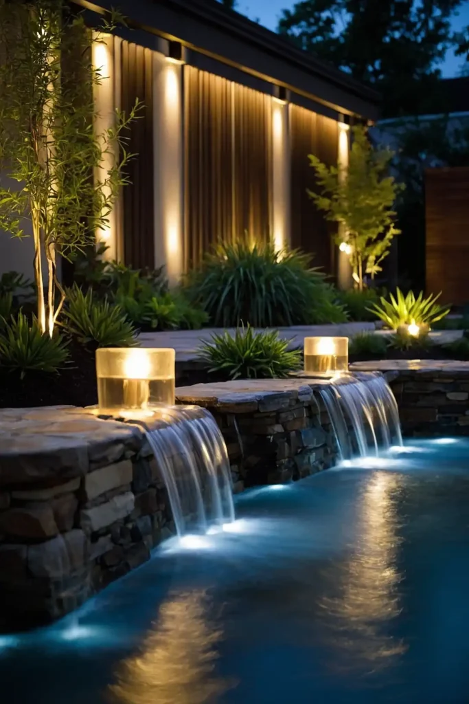 Secure lights slightly above water level using landscape stakes or hidden mounting hardware. The doubled effect of direct and reflected light amplifies their impact.