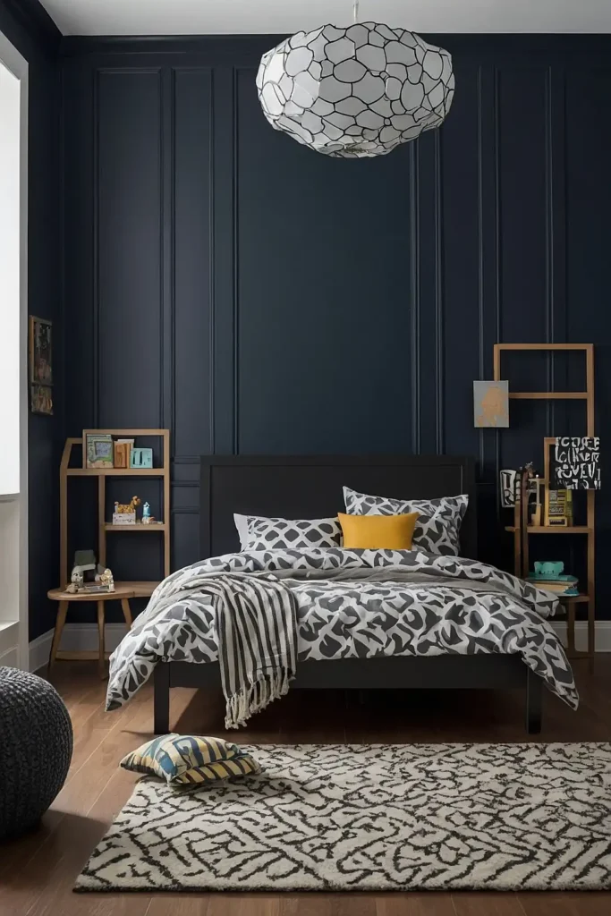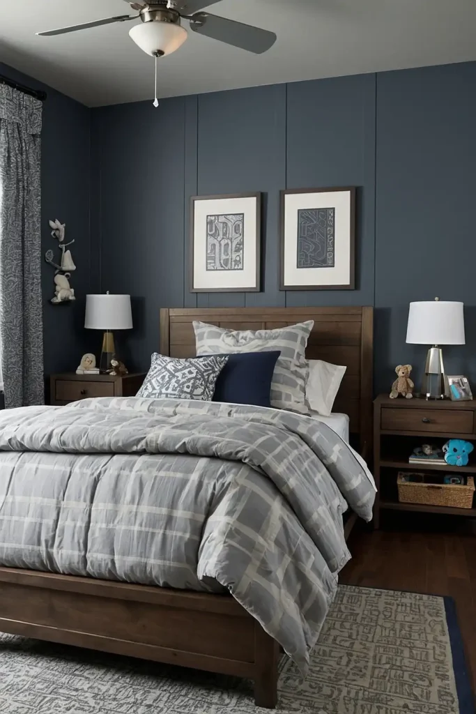 Stormy blue creates dramatic sophistication perfect for older boys and teens.