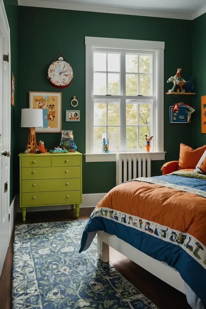 This vibrant yet sophisticated color creates a space that feels both stimulating and comfortable for active boys.