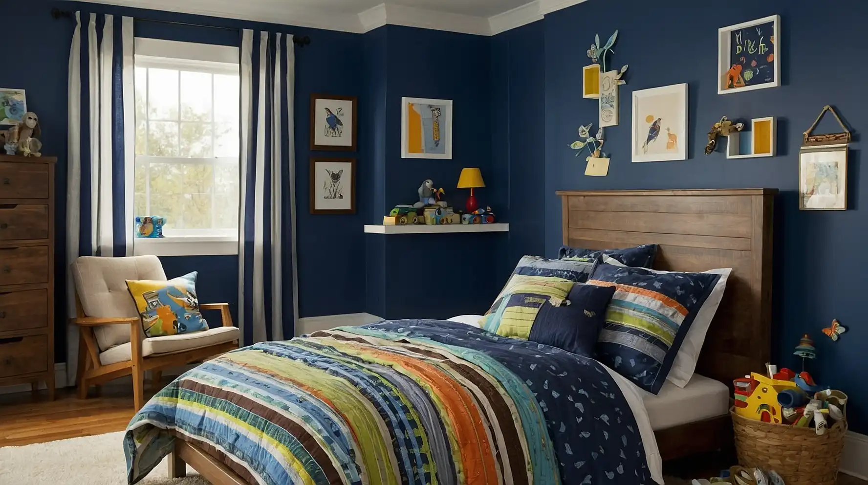 This vibrant yet sophisticated color creates a space that feels both stimulating and comfortable for active boys.