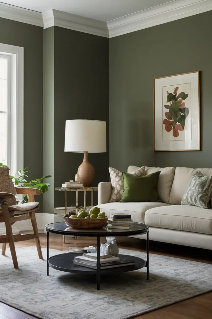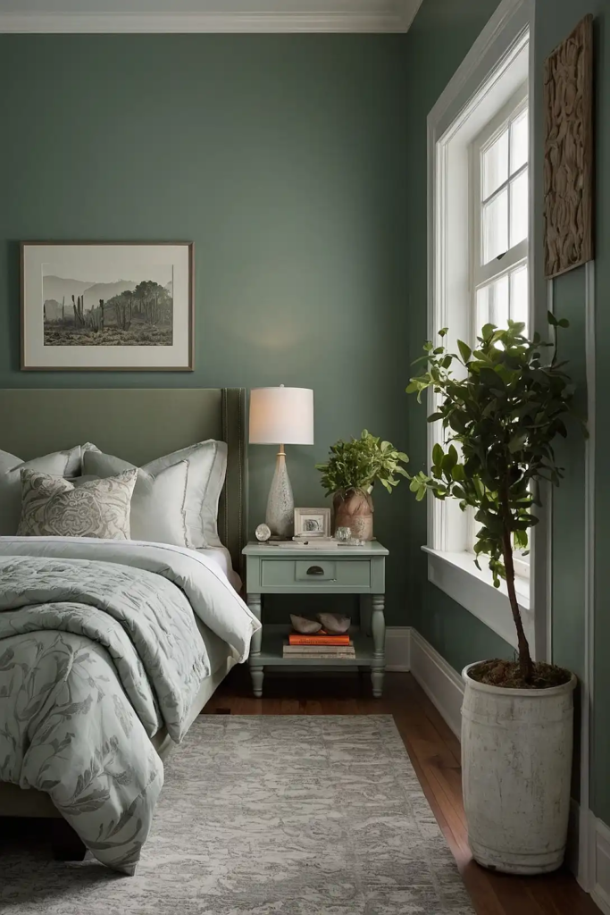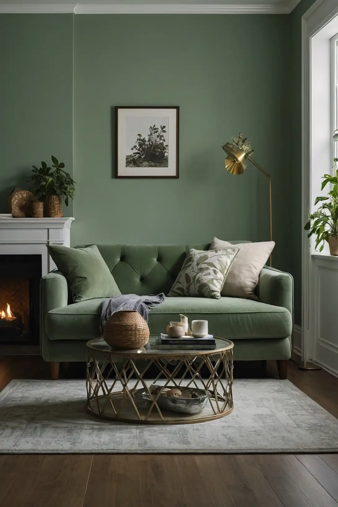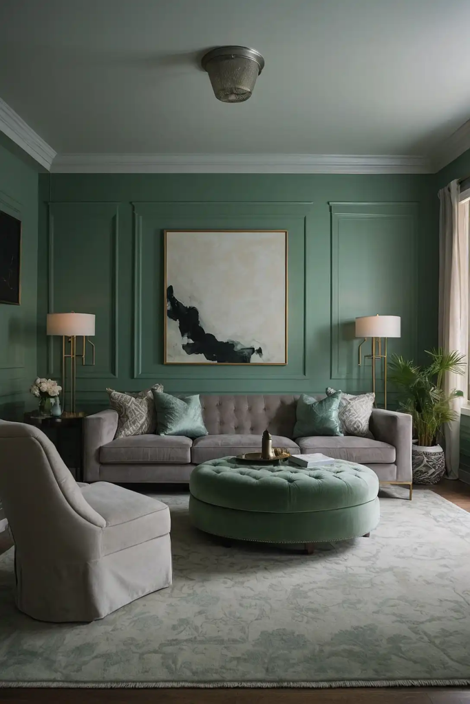 This muted green with gray undertones retains its character even in dim spaces, unlike brighter greens that can turn muddy.