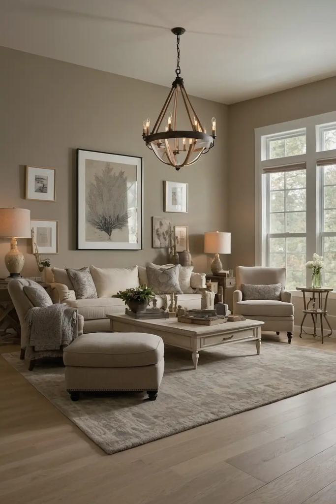 Warm greige—that perfect blend of gray and beige—creates a sophisticated neutral foundation that maintains warmth in low light settings.