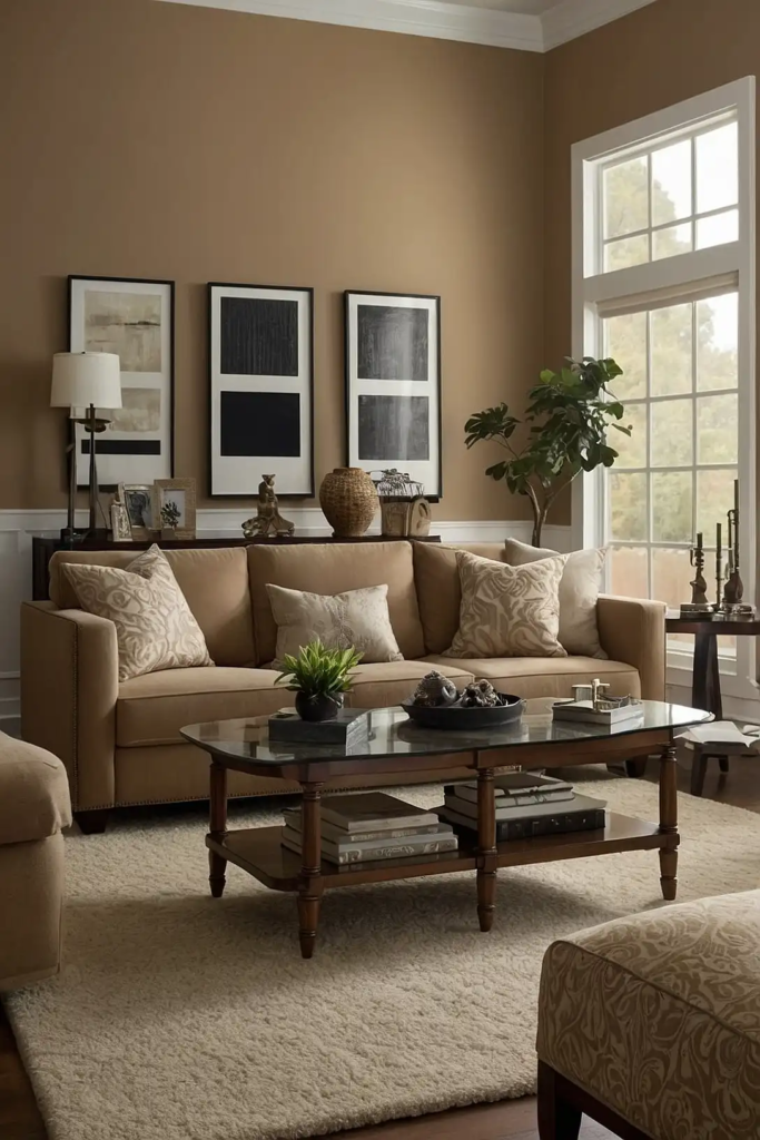 Unlike darker beiges that can feel heavy, soft camel maintains lightness while providing warmth that counteracts the cool shadows in dim spaces.