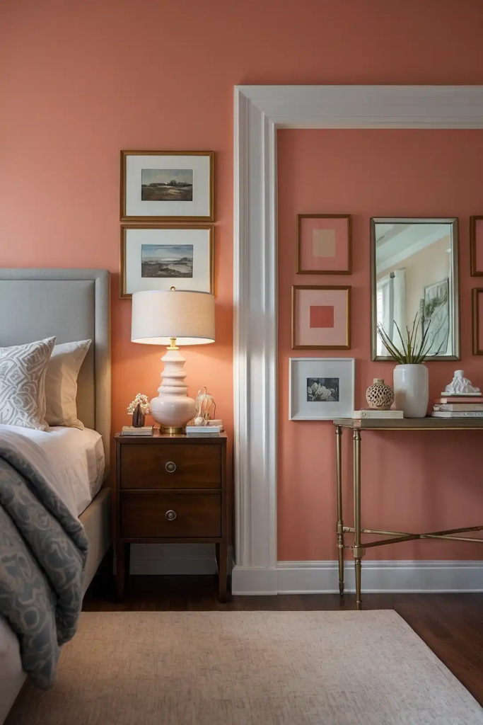 Muted coral creates a flattering glow that makes the space feel welcoming and special.