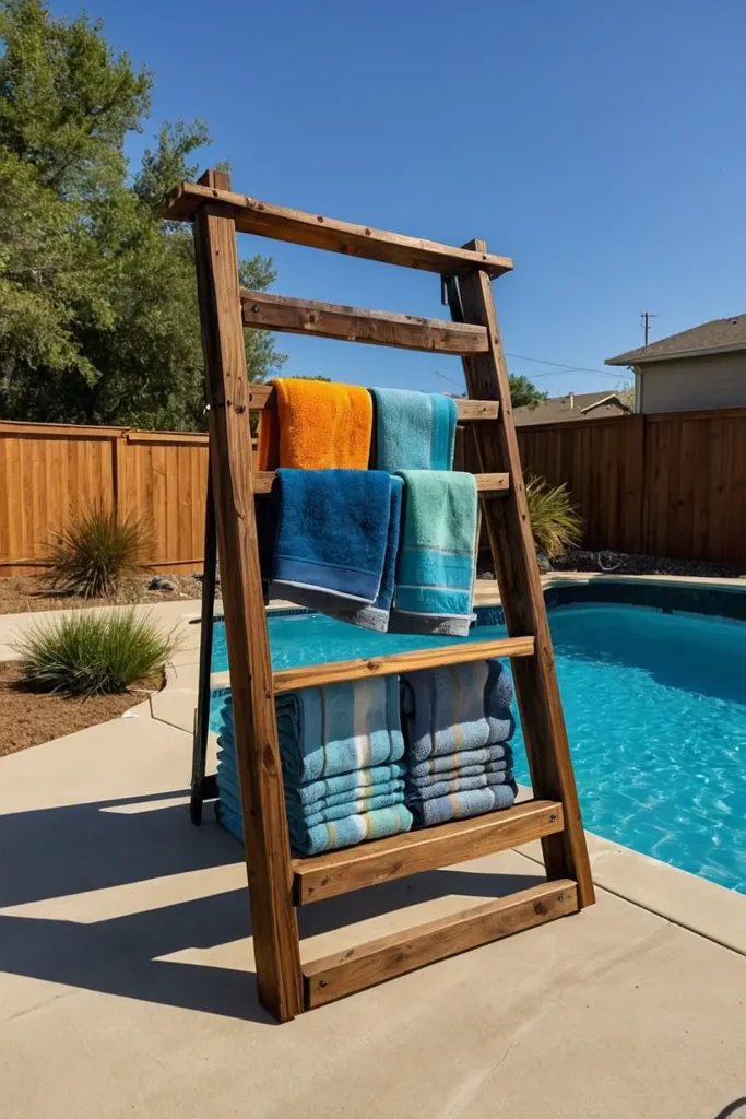 Transform an old wooden ladder into a poolside towel rack by sanding, painting, and sealing it for outdoor durability.