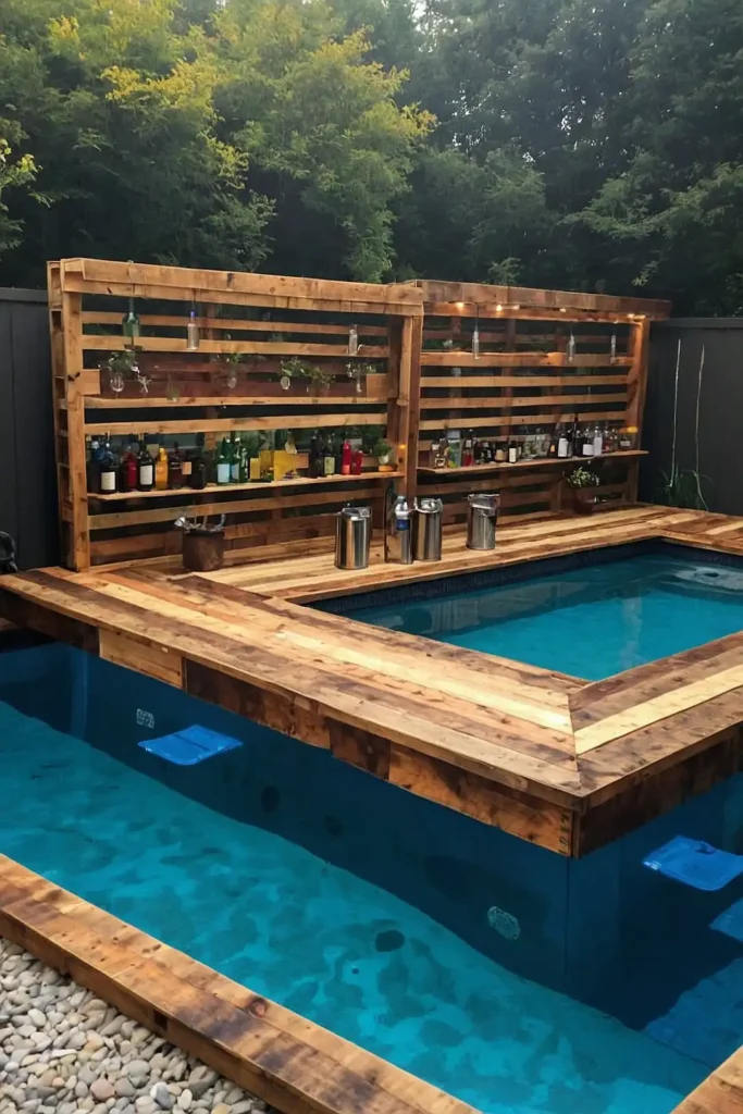 Transform wooden pallets into a rustic pool-side bar for convenient drink and snack service without leaving the water.