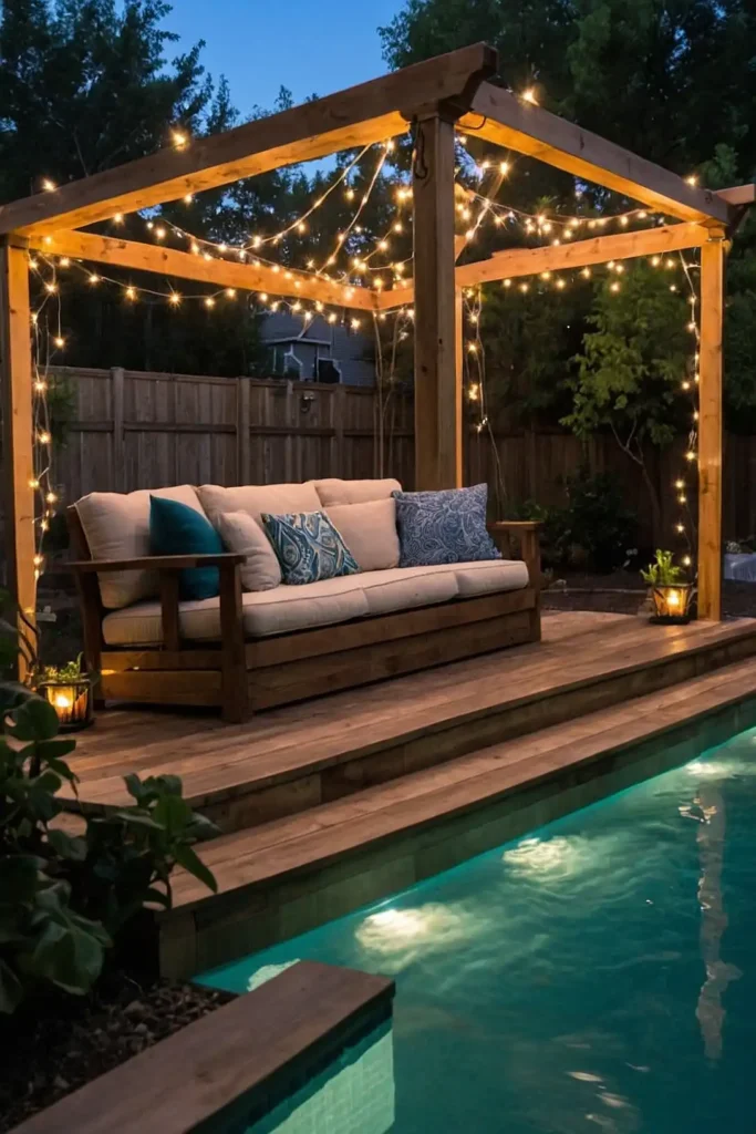 Install weather-resistant string lights above your pool area to create a magical evening environment.