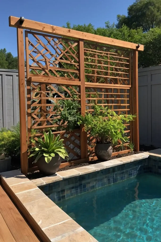 Construct simple wood trellis panels on the exposed sides of your pool and train climbing plants to create living walls.