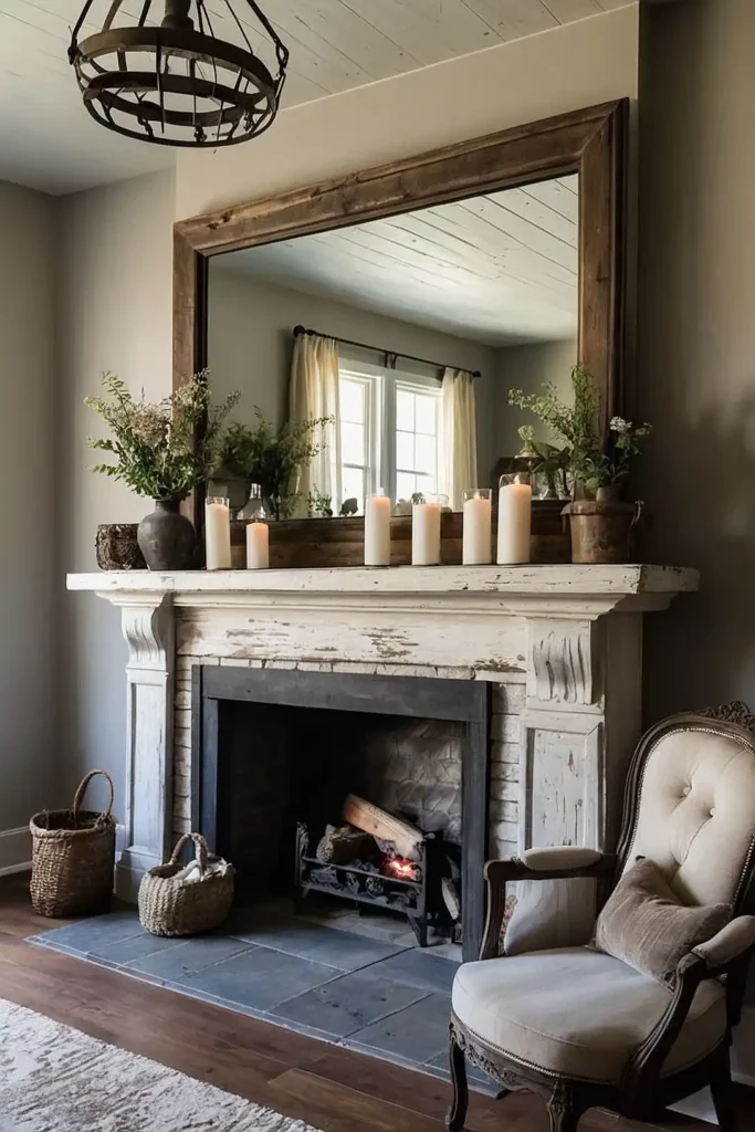 Hang an ornate vintage mirror with a distressed frame above your mantel to reflect light and create visual depth.