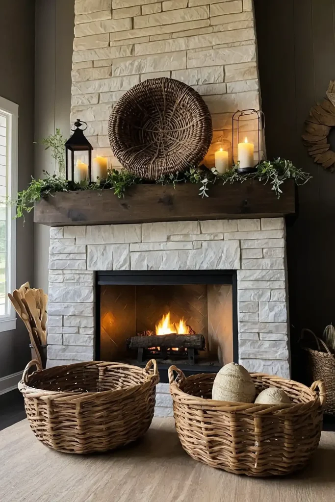 Mount flat-back baskets directly on your fireplace wall or arrange three-dimensional versions on your hearth.