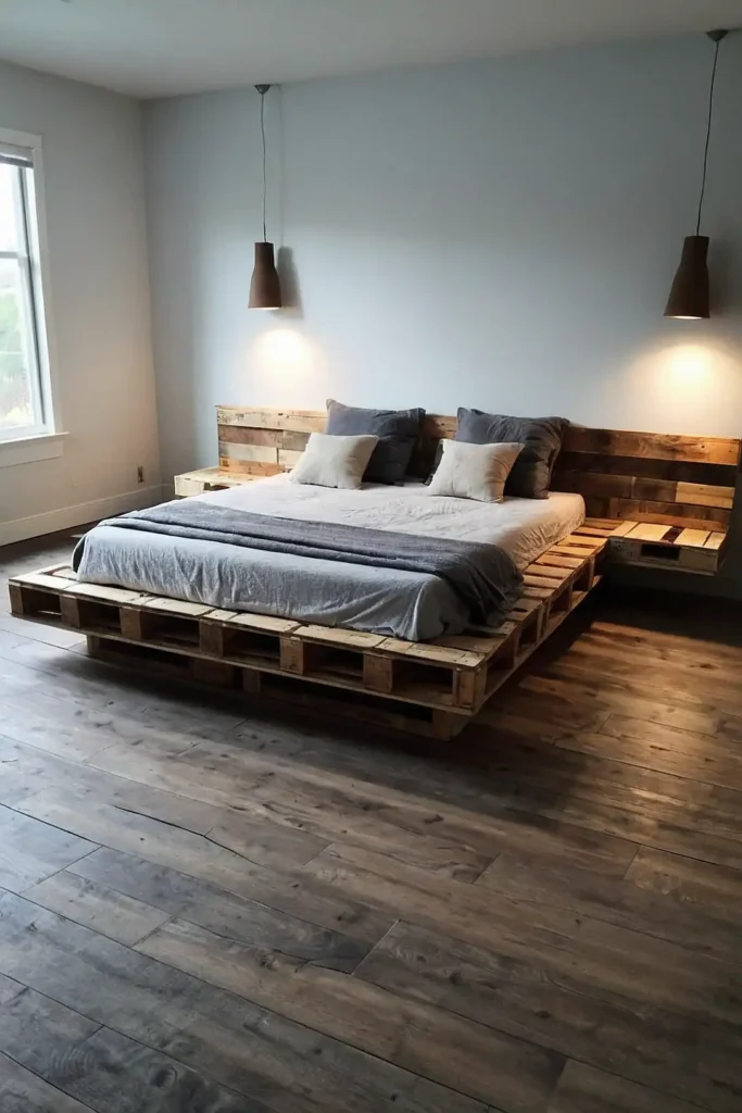 Design a bedroom focal point by connecting three pallets horizontally – one central pallet for the headboard with two acting as nightstands.