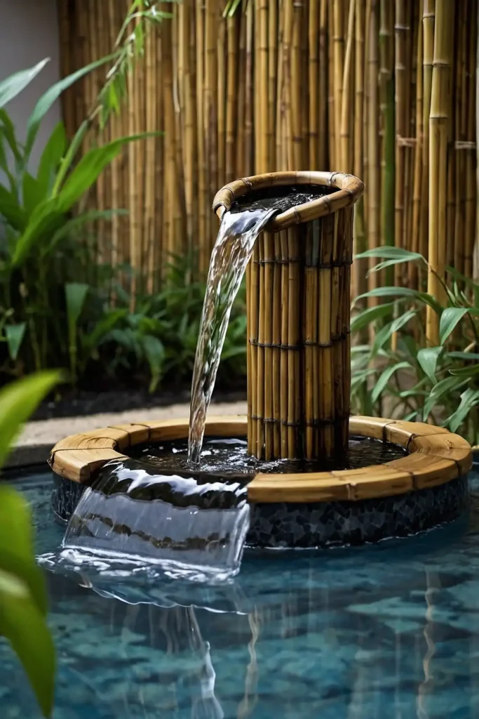 Craft an Asian-inspired fountain using bamboo poles. Create a tilted water channel that delivers water from a hidden reservoir.