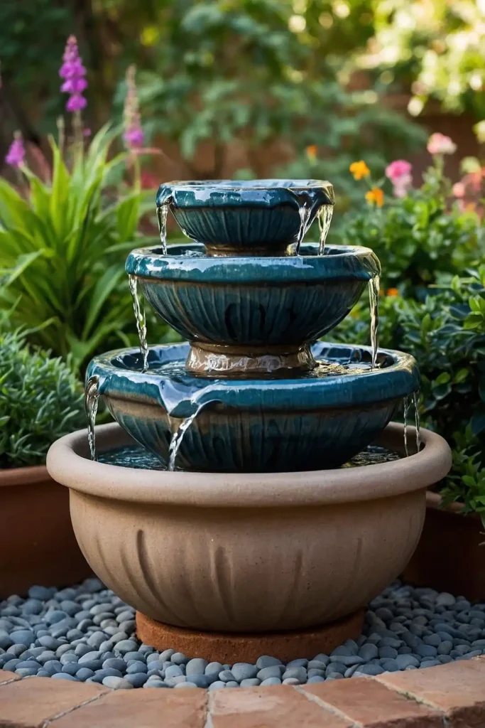 Hide a small submersible pump in the base pot and run tubing through each level. The rustic clay color blends beautifully with garden settings.