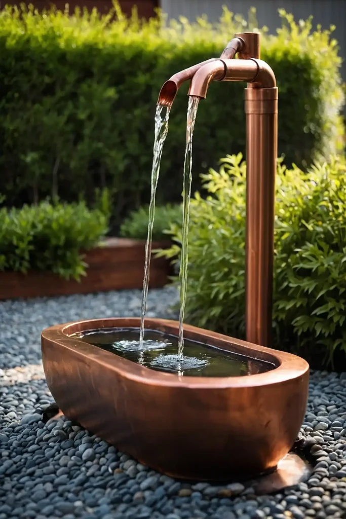 Fashion a modern fountain using copper pipes arranged in a geometric pattern. Cut pipes into various lengths and connect them with fittings.