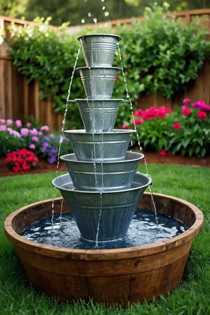 Stack different sized galvanized buckets or tubs to create a rustic cascading fountain. Secure each level and install a pump in the bottom container.