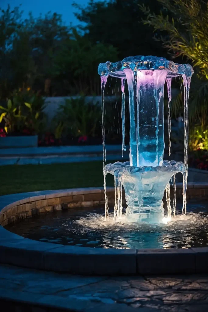 Create a winter wonderland with a fountain designed to form ice sculptures in cold weather. Use a heating element in the basin to keep the pump from freezing.