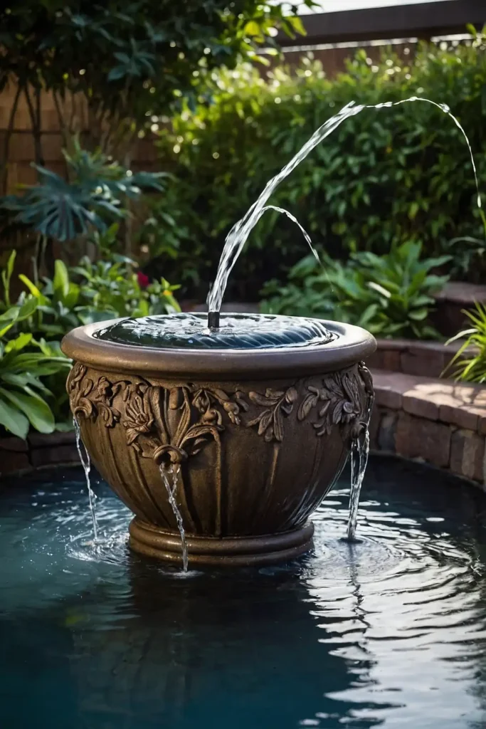 Place a large decorative urn or jar on a hidden reservoir. Install a pump that sends water up through the urn’s center.