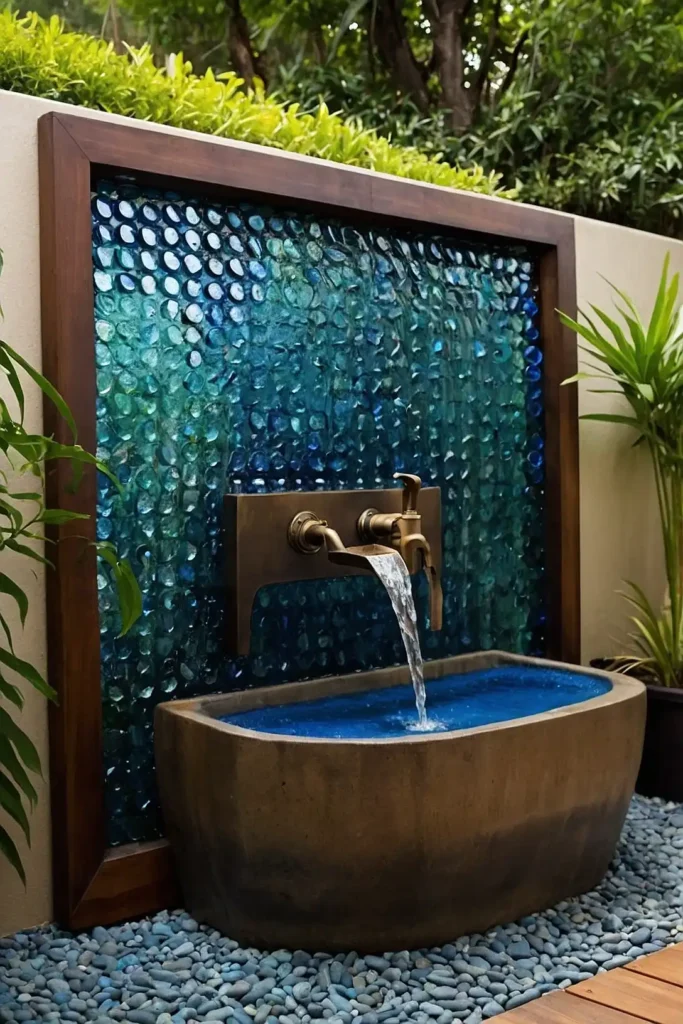 Craft a stunning water wall using recycled colored glass bottles. Embed them horizontally into a frame with the openings accessible from behind.