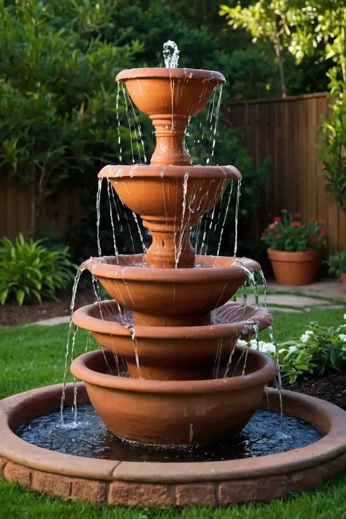Create a charming tiered fountain using different sized terracotta pots. Stack them at varying angles with the largest at the bottom.