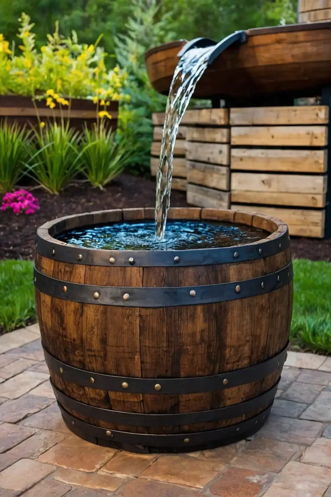 Repurpose an old whiskey barrel into a rustic fountain. Cut the barrel in half and use the bottom portion as a water basin.