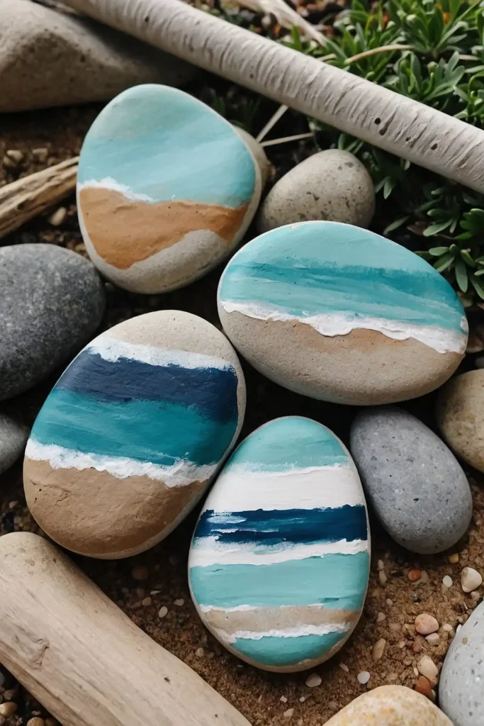Paint simple designs like starfish, waves, or inspiring words. Seal with clear waterproof spray to protect your creations and enhance colors.