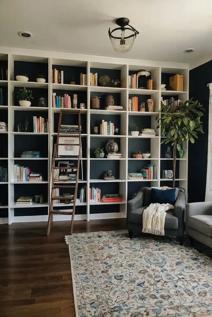Install a sliding library ladder system across multiple Billy bookcases to access higher shelves while adding architectural interest.