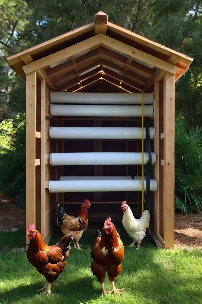 Utilize the space inside your coop walls by installing large-diameter PVC pipes as storage tubes for supplies.