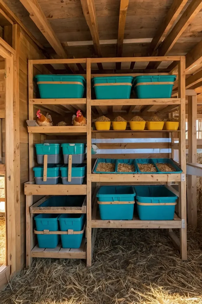 Build sealed feed storage containers directly into your coop’s interior walls for immediate access during feeding time.