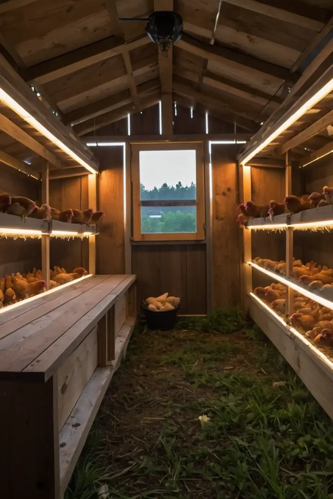 Install energy-efficient LED lighting with programmable timers to optimize egg production during shorter winter days.