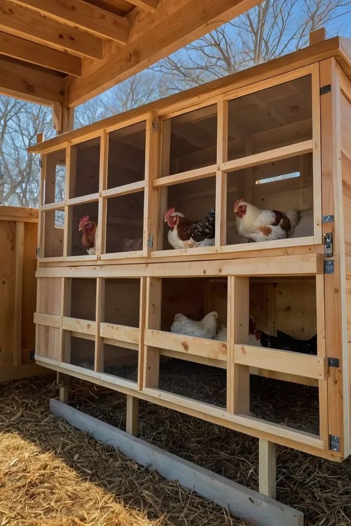 Design external-access nesting boxes with Dutch-style split doors for egg collection without entering the coop.